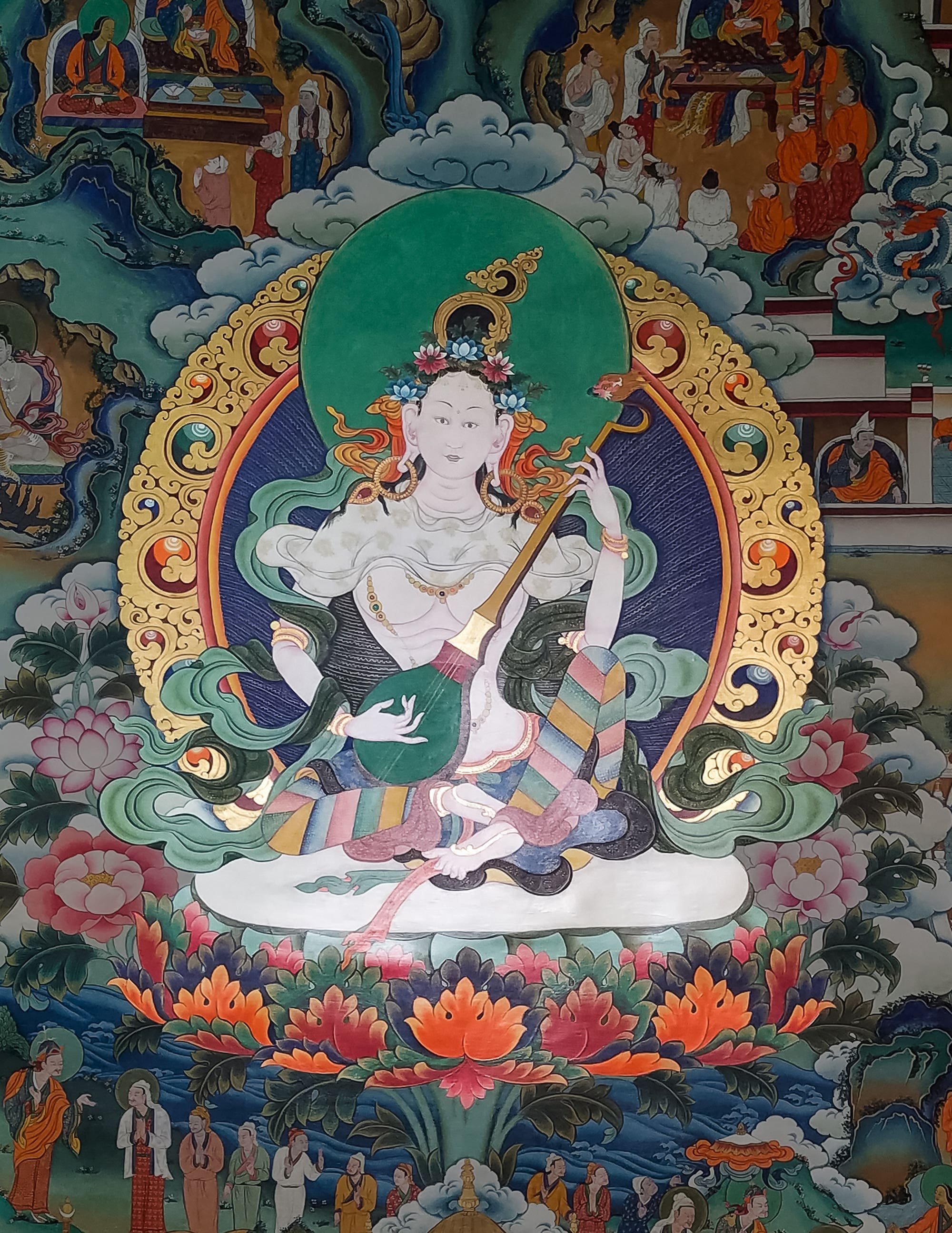 From 2017-2019, at Yeshe Tsogyal’s birthplace in Tibet, we initiated and funded the first-ever narrative murals depicting Yeshe Tsogyal’s famous lifestory of liberation, as well as murals of the main Longchen Nyingthik. Mapping Out the Murals; Mural Painter at Work; https://vimeo.com/287507510; https://vimeo.com/360192263. Download the Yeshe Tsogyal Saraswati mural figure.